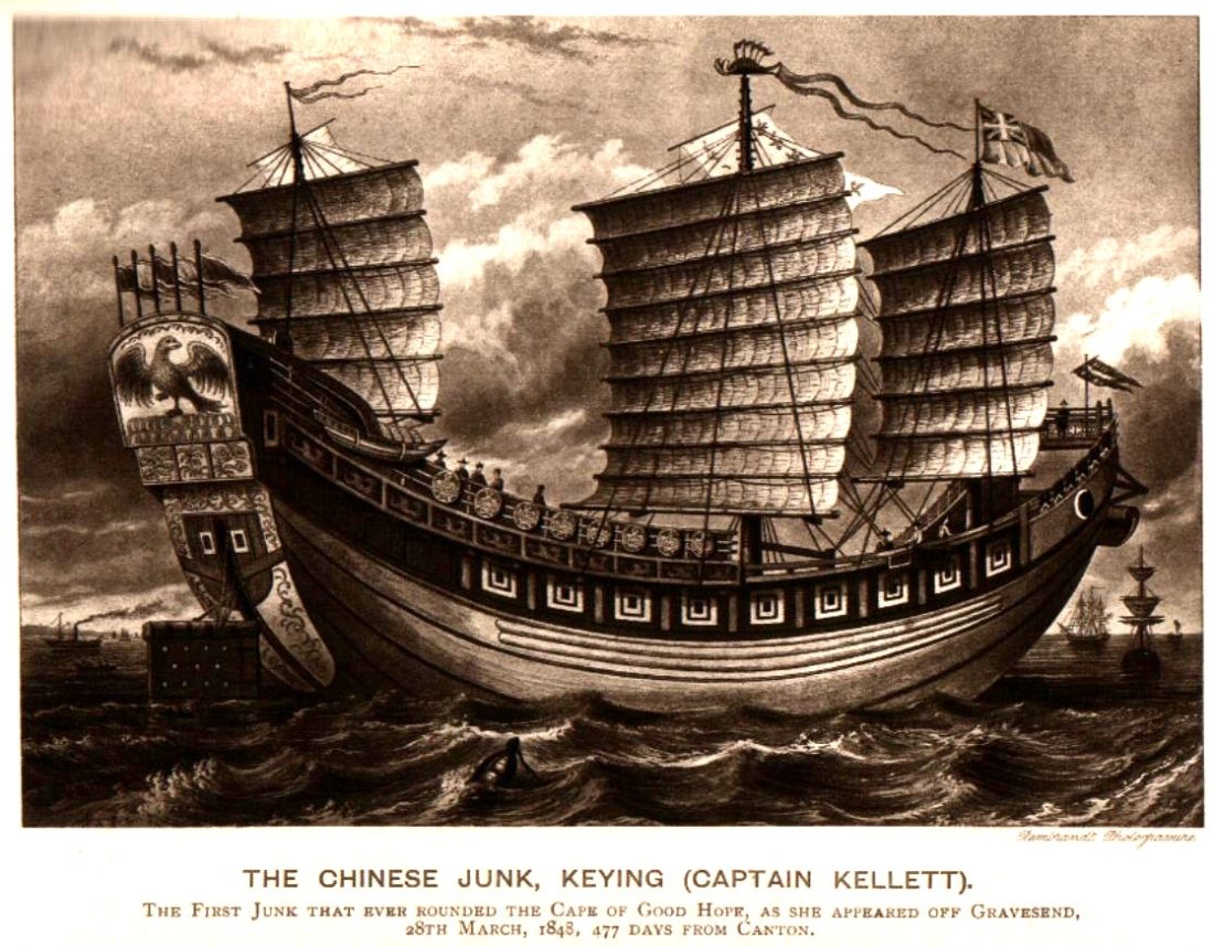 In a 1912 book entitled “The Sea Trader – His Friends and Enemies” I came across the engraving illustrated here. I found it wholly fascinating as it refers to the Keying, “The first junk that ever rounded the Cape of Good Hope, as she appeared off Gravesend, 28th March 1848, 477 days from Canton”